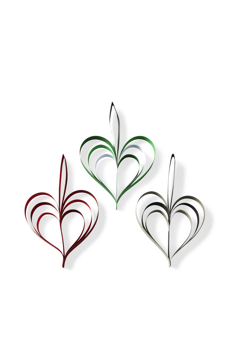 - Taita muut liuskat keskelle molemmilta puolilta, kiinni ripustimeen, niin että kuviosta tulee sydän (kts kuva). Liimaa liuskojen päät kiinni ripustimeen.