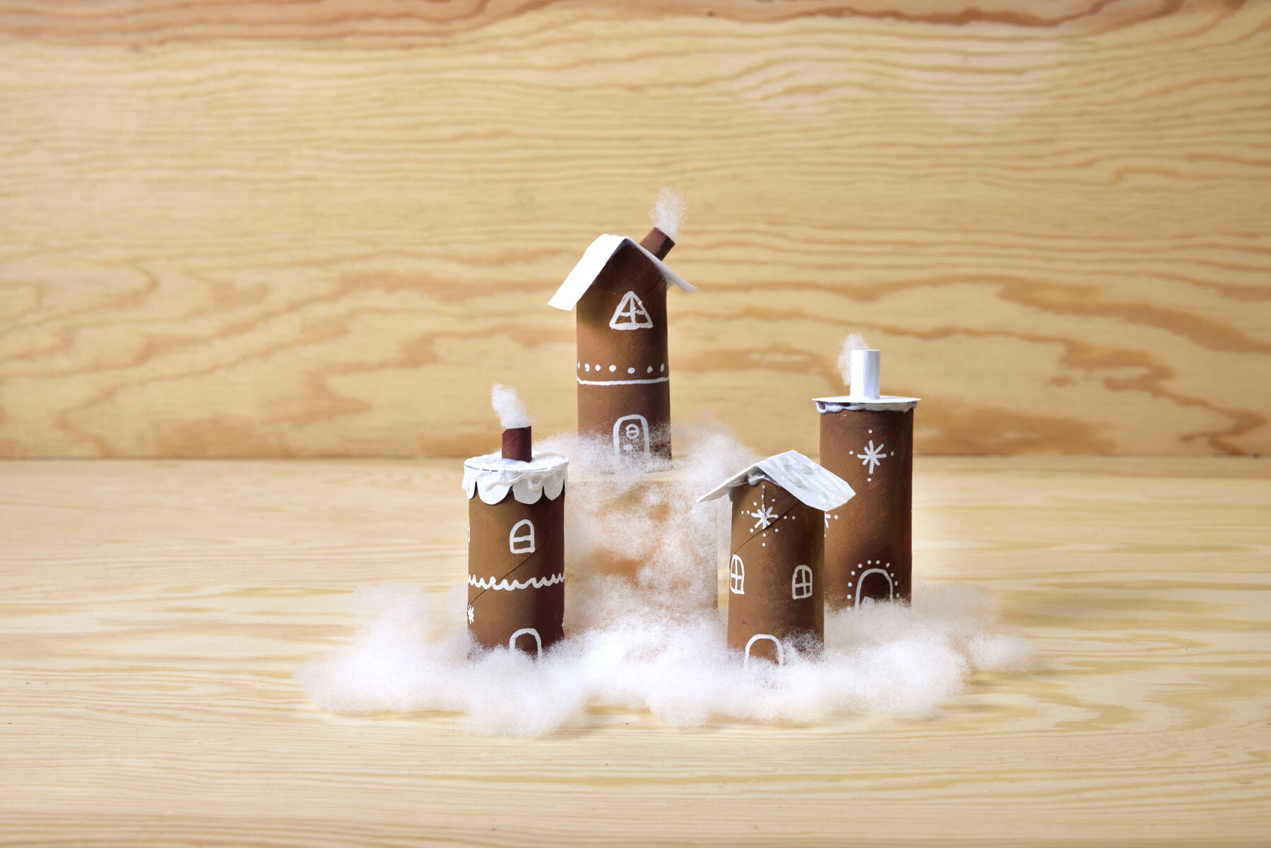 - Leikkaa valkoisesta paperista katto ja kiinnitä se talon yläosaan. Rullaa pieniä paloja ruskeasta kartongista savupiipuksi ja liimaa katolle.