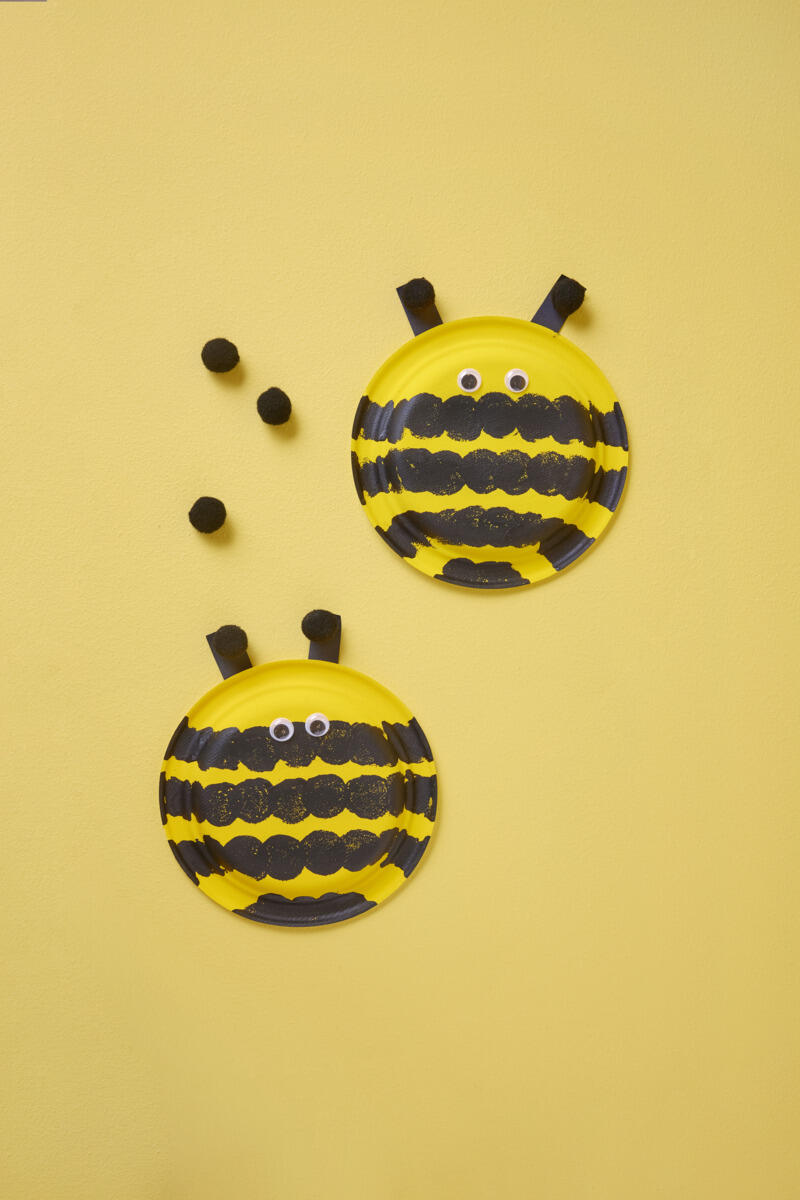 - Valmista tuntosarvet mustasta paperista ja pompomeista ja liimaa ne lautasen taakse.