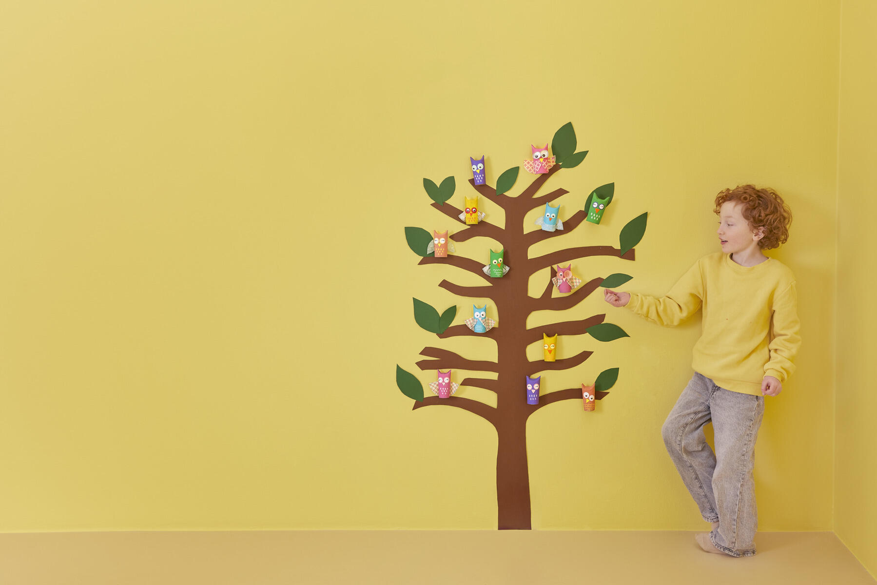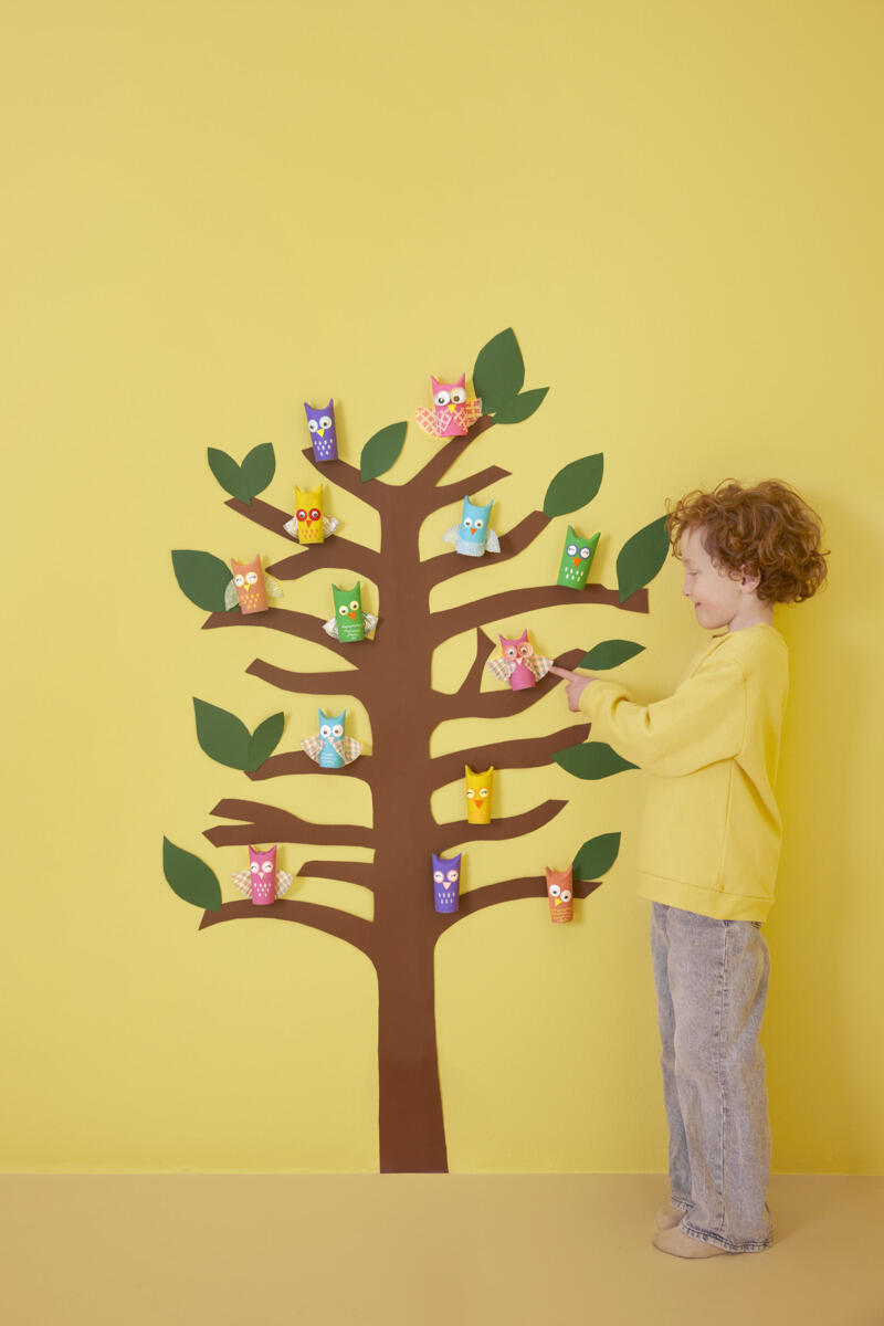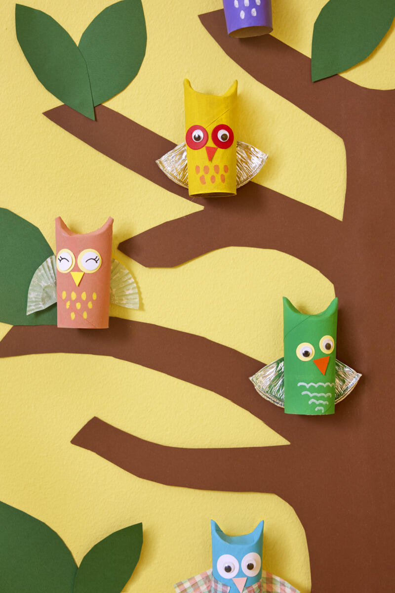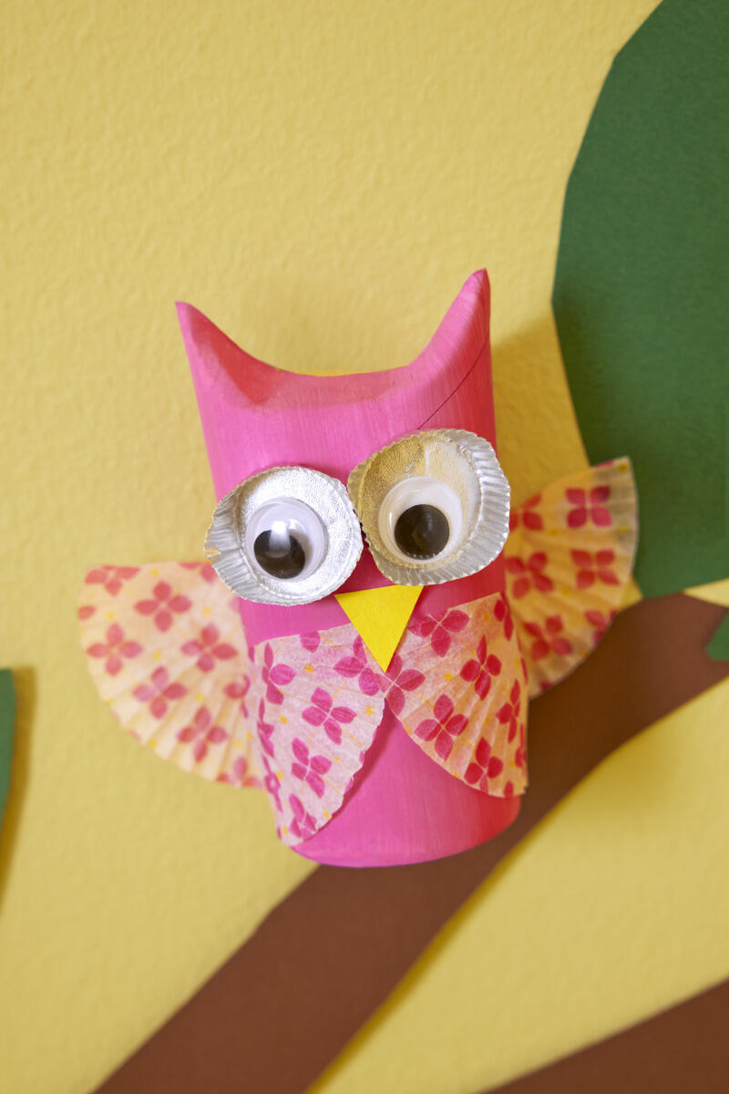 6. Koristele pöllö haluamillasi materiaaleilla, kuten leivosvuokilla, muovisilmillä, höyhenillä ja paperilla. Anna mielikuvituksen lentää.
