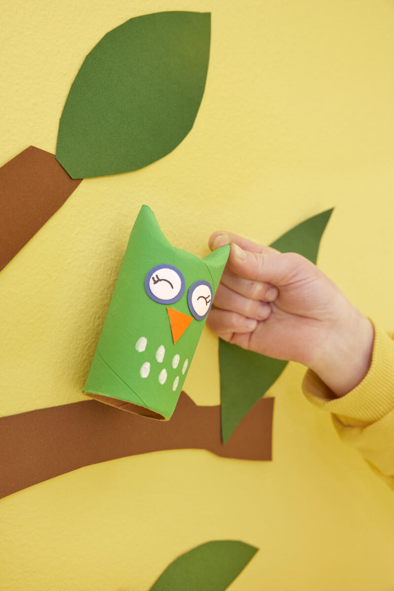 7. Paina hieman sinitarraa pöllön taakse ja kiinnitä pöllö puuhun.