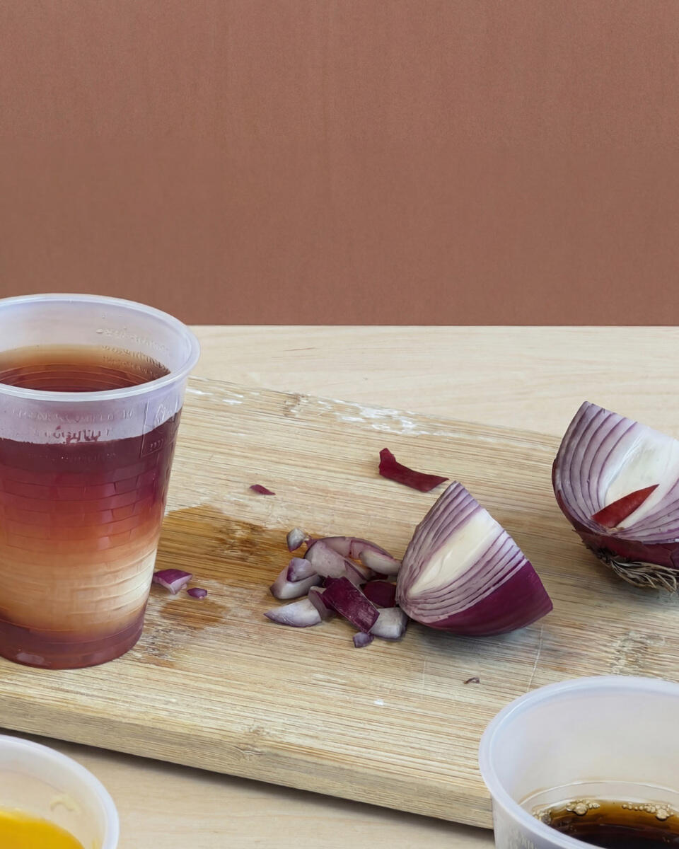 - Valitse luonnollinen, voimakkaan värin antava ruoka‑aine, esimerkiksi mustikka, punasipuli, kurkuma, punajuuri tai kahvi.