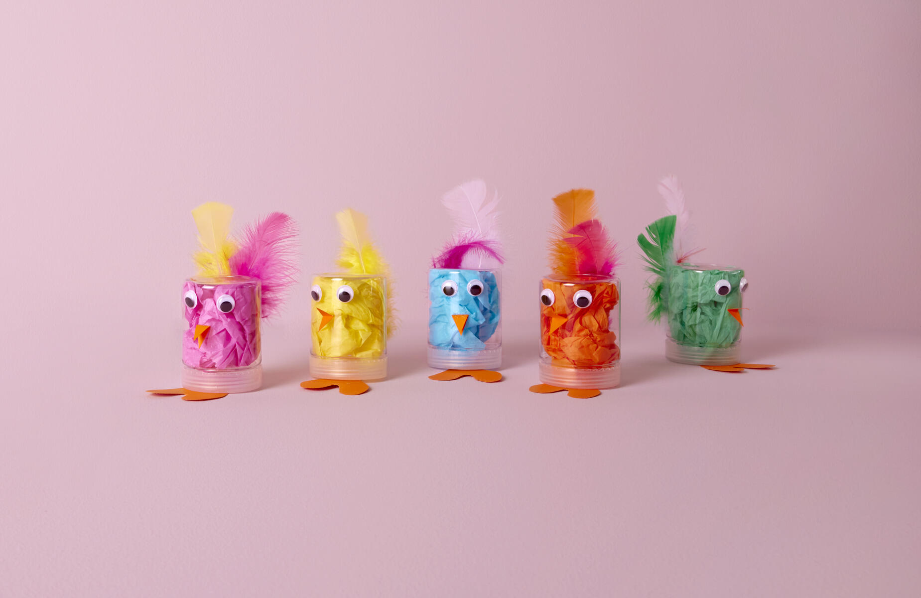 - Liimaa purkkiin muoviset silmät ja kiinnitä purkin takaosaan yksi tai useampi värikäs höyhen.