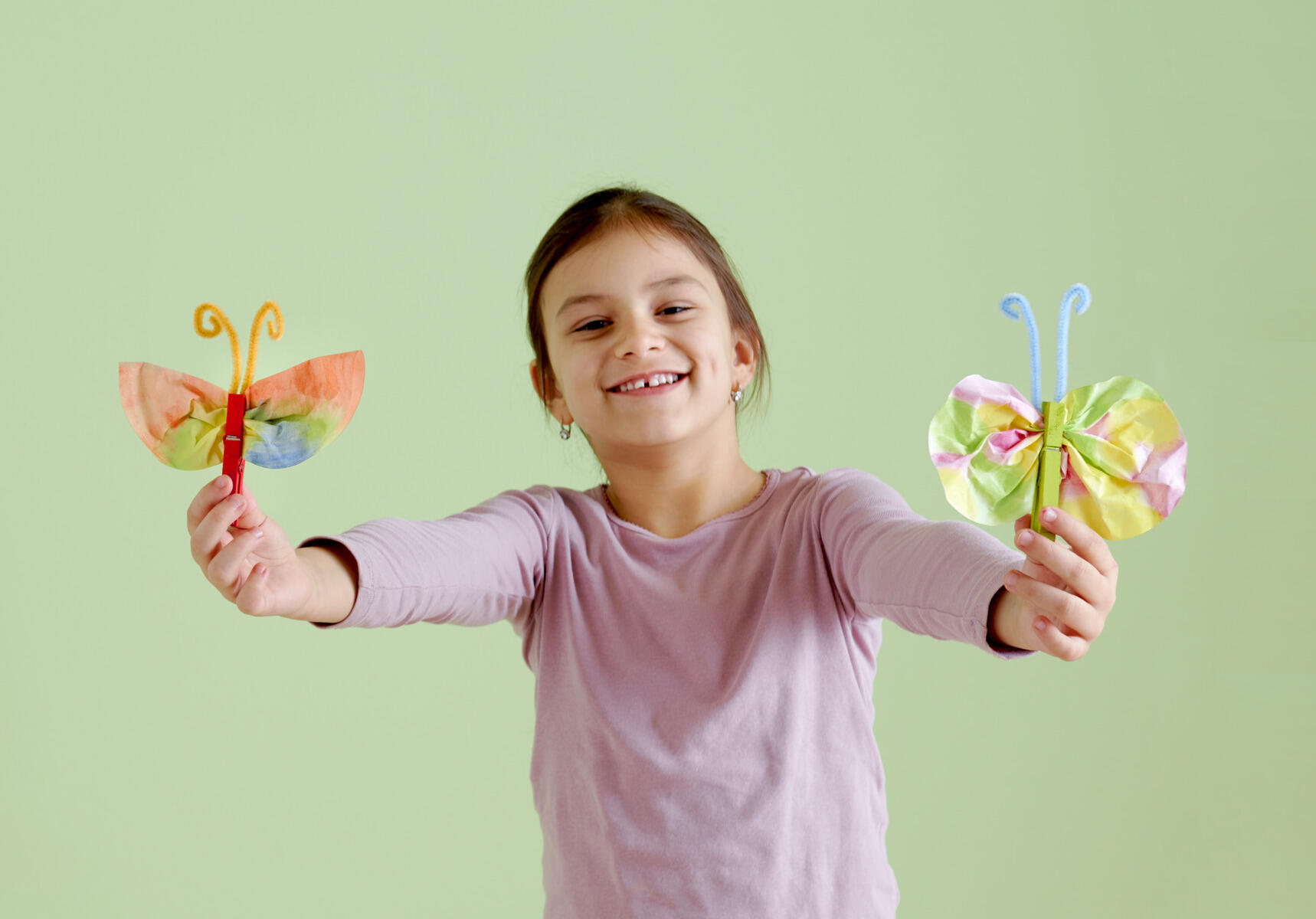 - Ota haluamasi väriset askartelupunokset, leikkaa, taita puoliksi ja tee antennit. Avaa pyykkipoikaa hieman ja aseta punokset väliin.