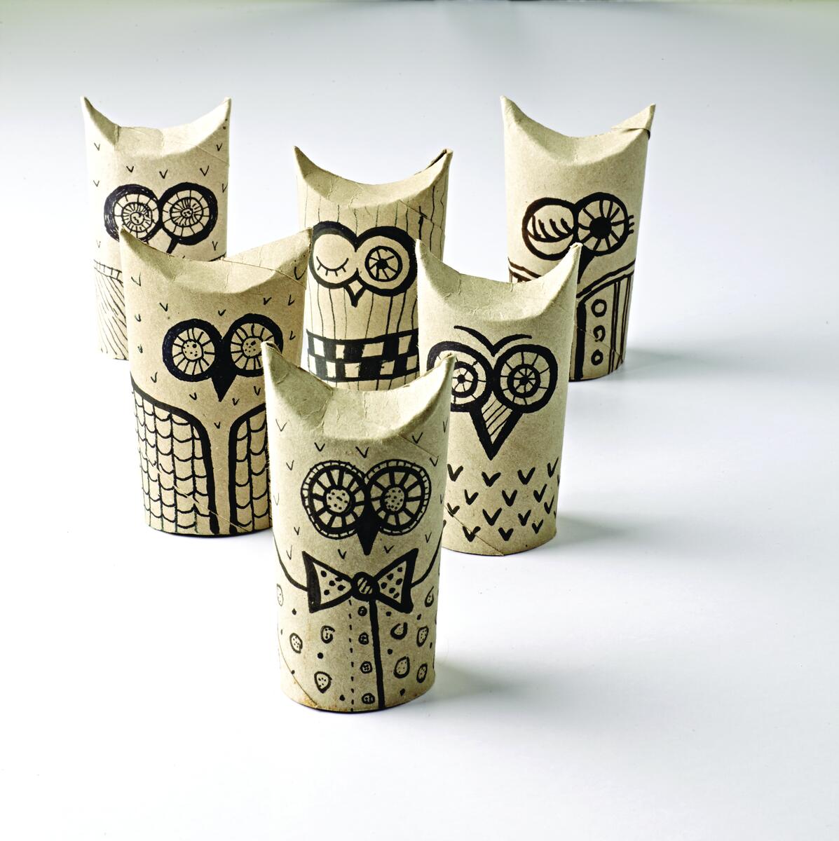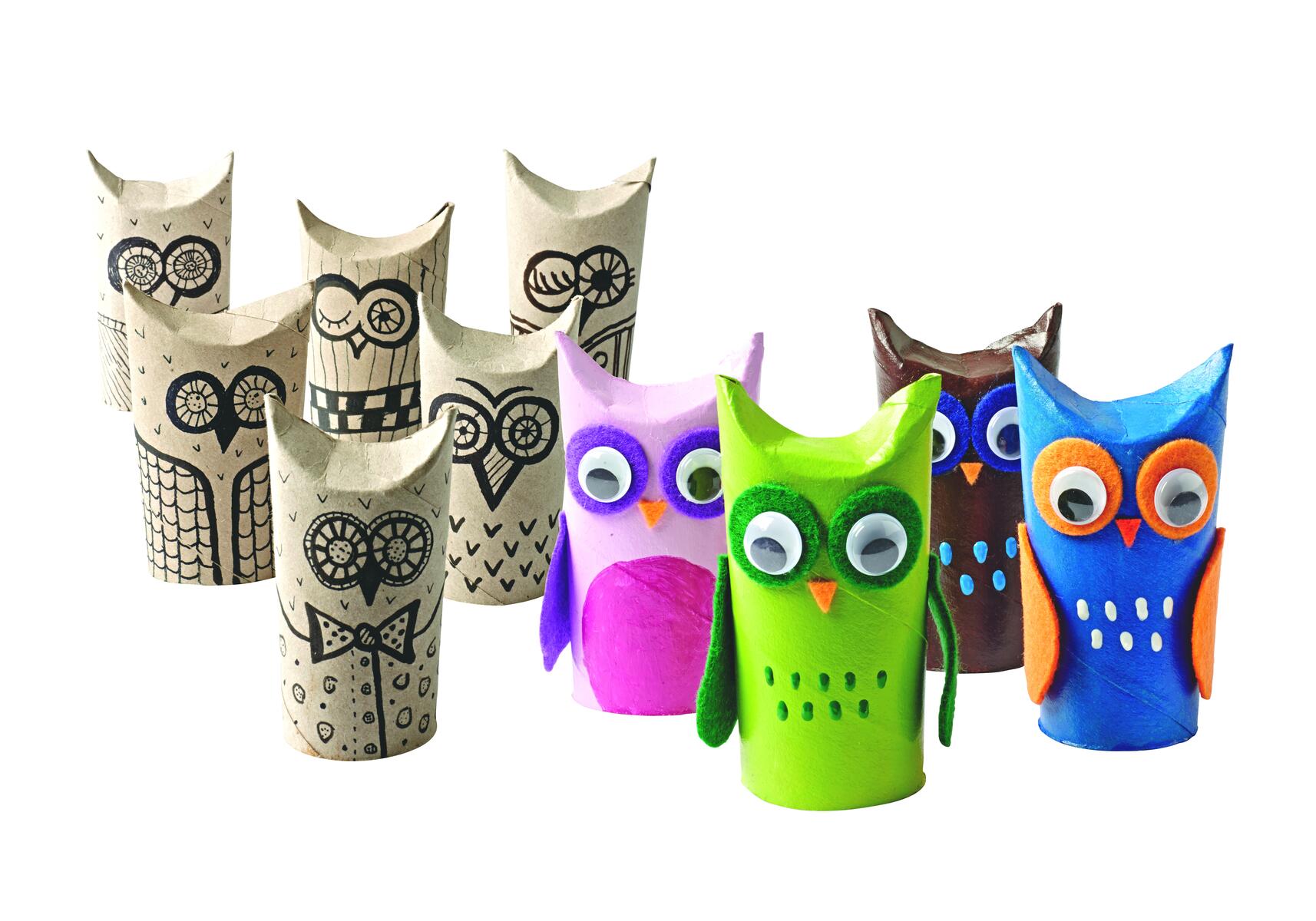 - Leikkaa pieni nokka askartelukartongista ja liimaa se ja silmät kiinni pöllöön.