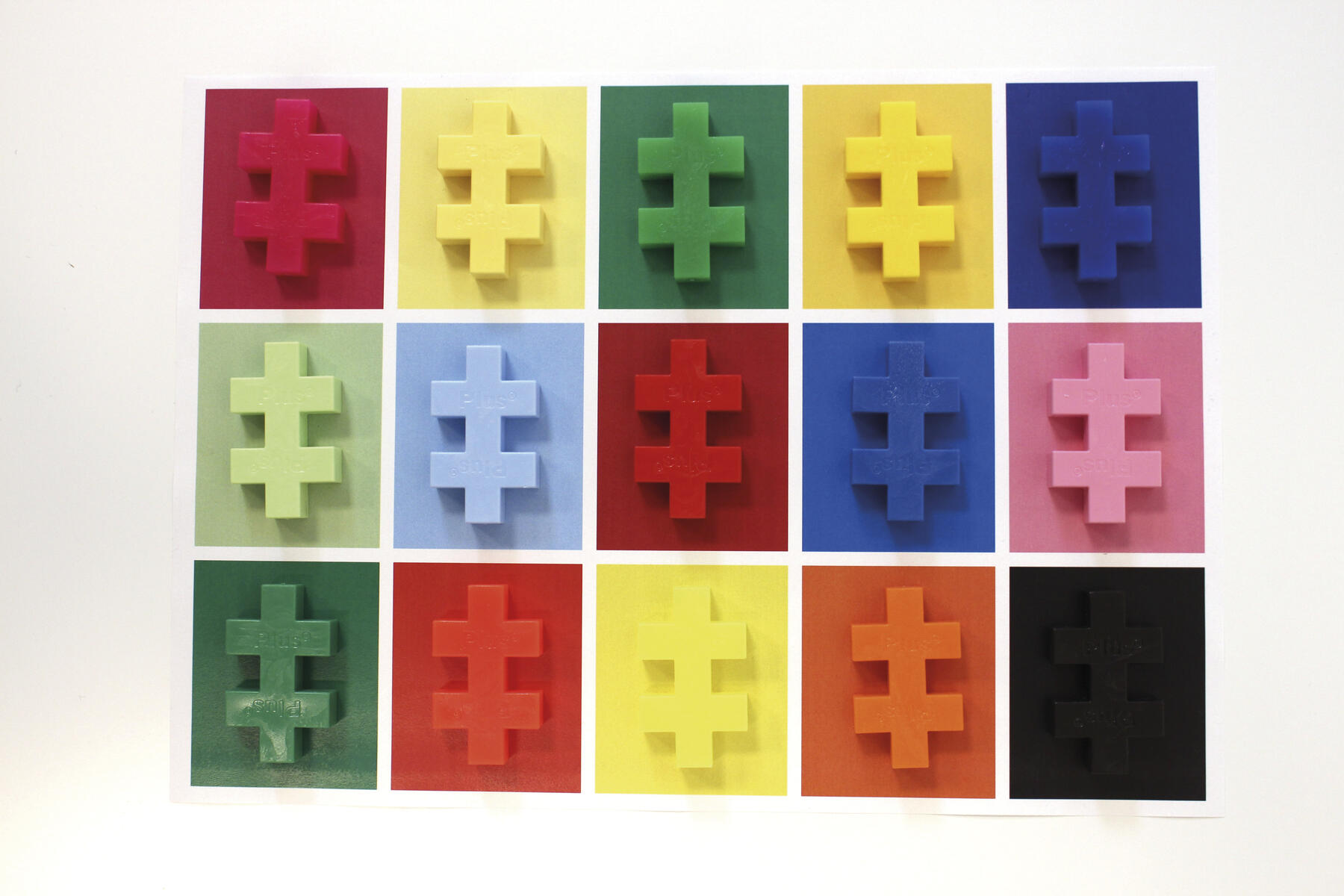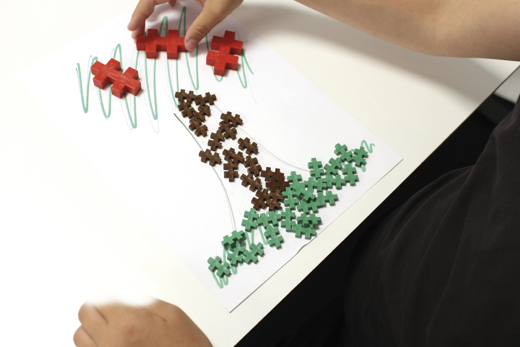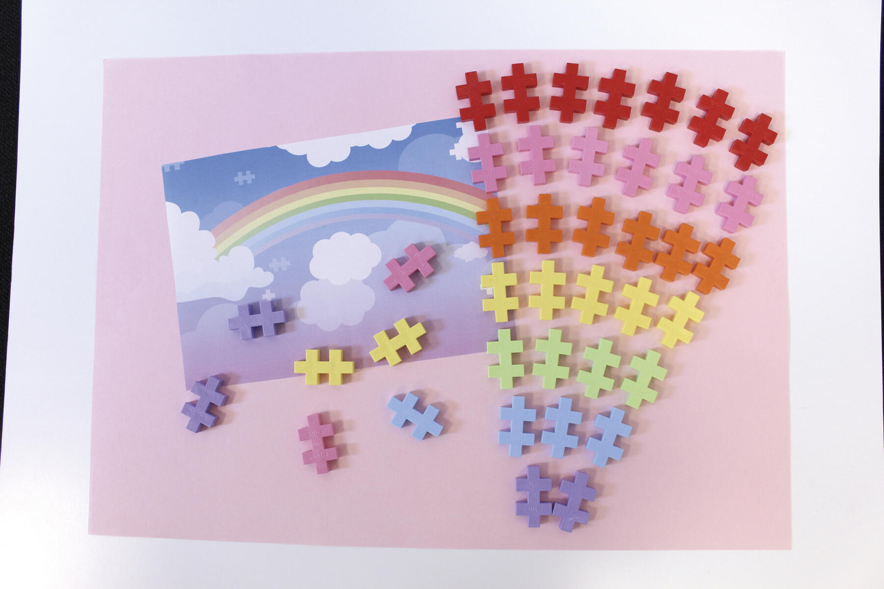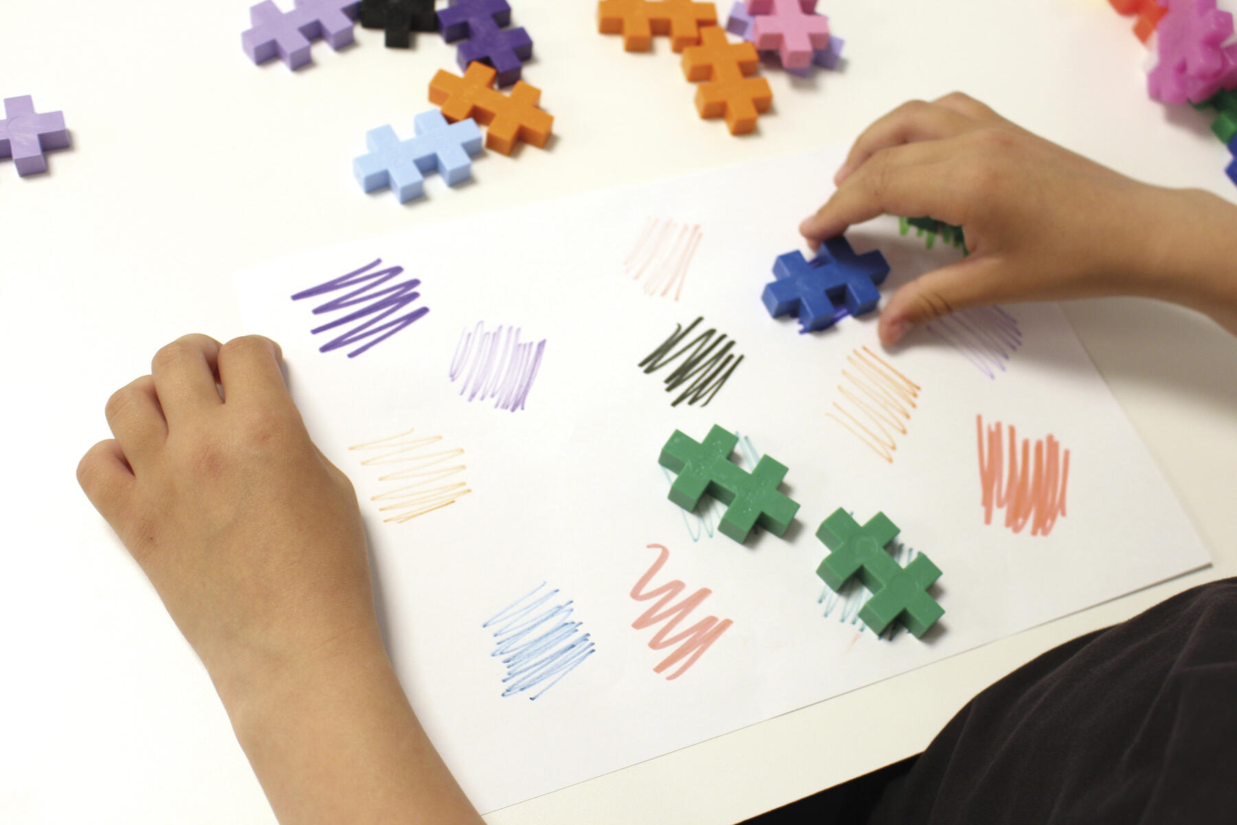 Ota eri värisiä kartonkeja tai kuva, jossa on eri värejä ja anna lasten yhdistää samanväriset PLUS-PLUS palikat ja kartongit.