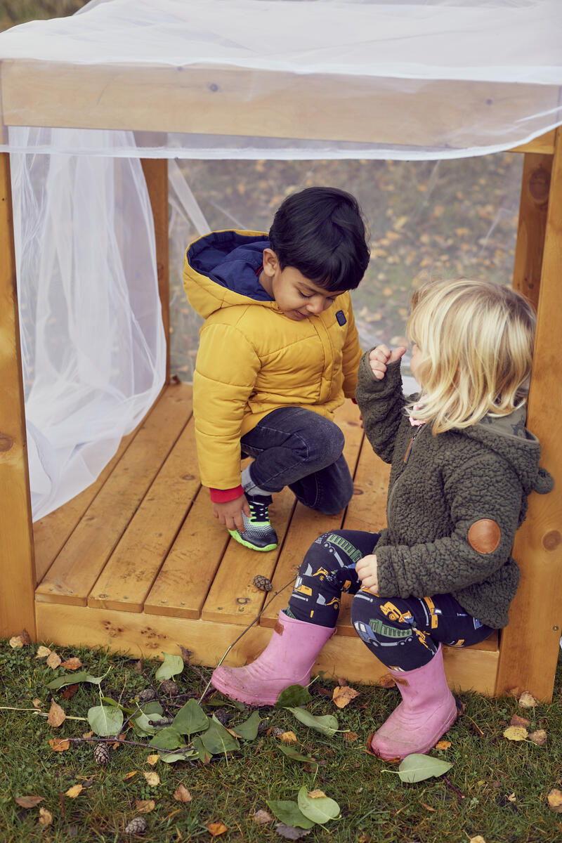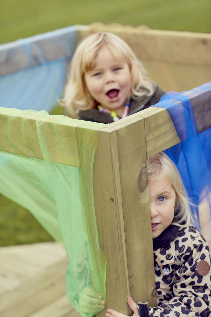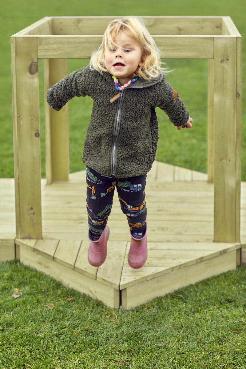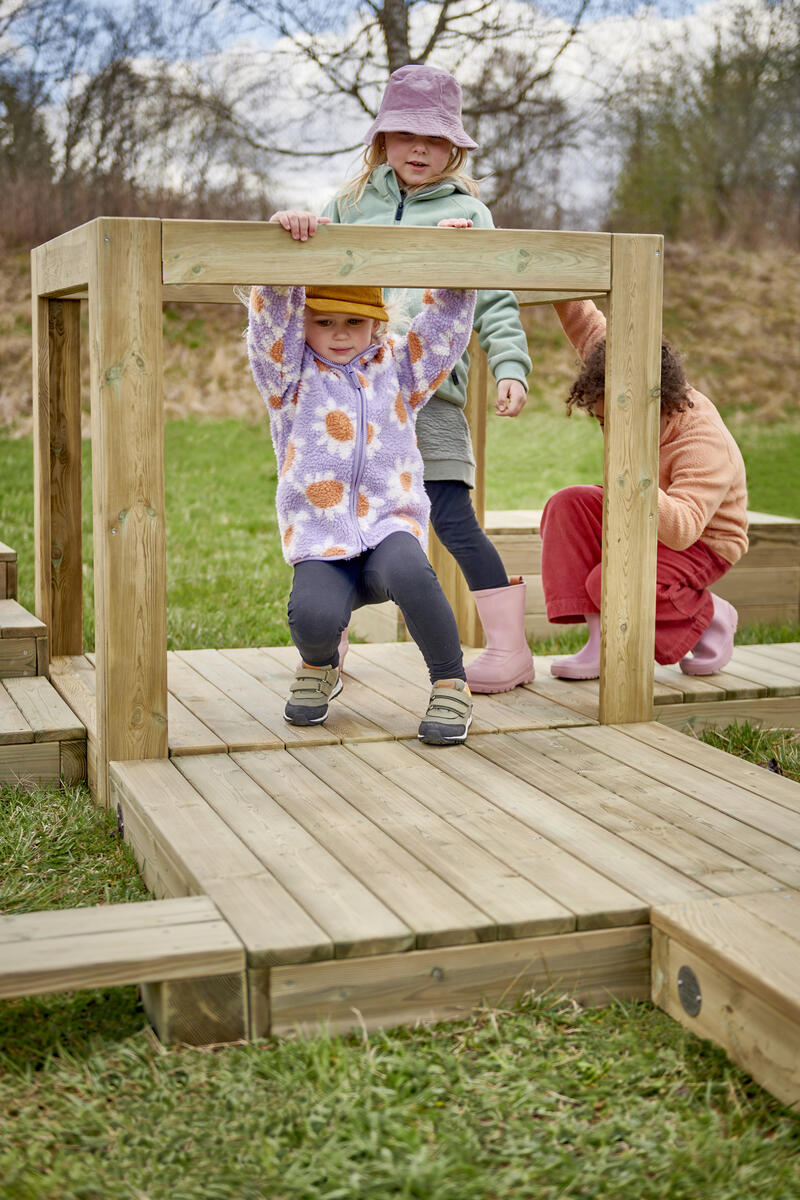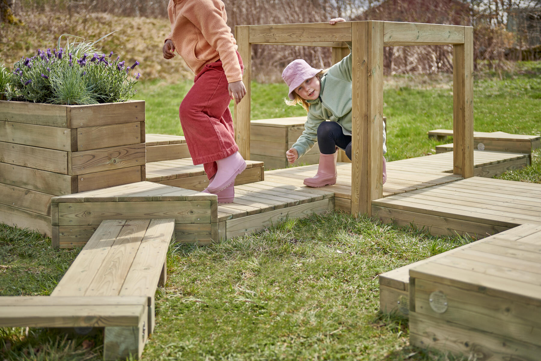 Tämä kuutiomoduuli on avoin mielikuvitukselle. Peitto muuttaa sen pieneksi taloksi, useampi kuutio yhdessä muodostaa rivitalon. Yhdistettynä sarjan muihin moduuleihin se voi olla kaikkea kuorma-auton lavasta piilopaikkaan tai jännittäväksi aistipaikaksi pihaympäristöön. Mukana ratkaisu maahan kiinnittämiseen, mikä tekee rakenteesta tukevan ja turvallisen ulkokäyttöön. Valmistettu kestävästä puusta, joka sopii päiväkotien ja koulujen arkeen. Öljytty versio säilyttää puun luonnollisen, käsittelemättömän ilmeen. Värin ja sävyn vaihtelut ovat puulle ominaisia ja vaihtelevat puun iän ja rakenteen mukaan. Öljytyn pinnan huoltoon suositellaan tarvittaessa vesiohenteista puuöljyä. Asiakas vastaa asennuksesta. Toimitusmaksu 100 €/tilaus.