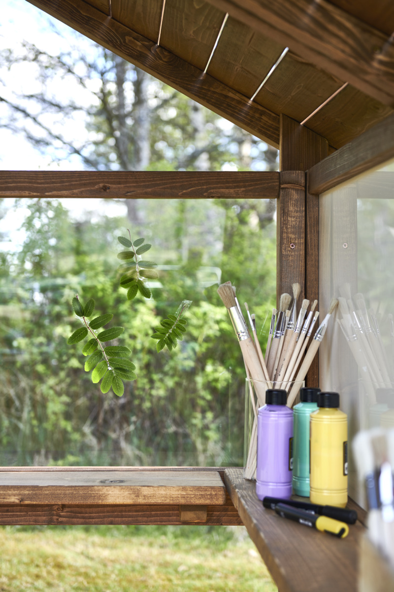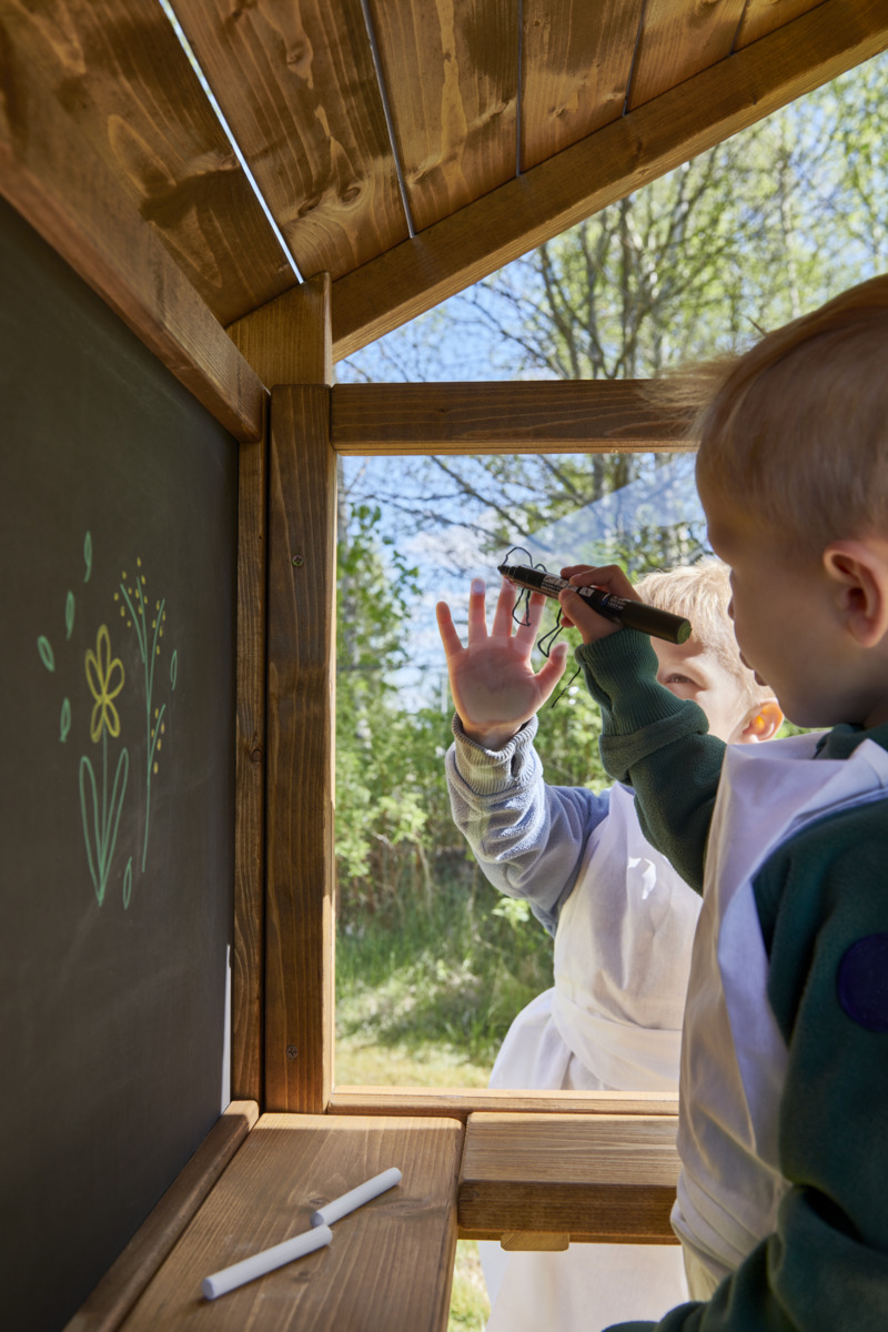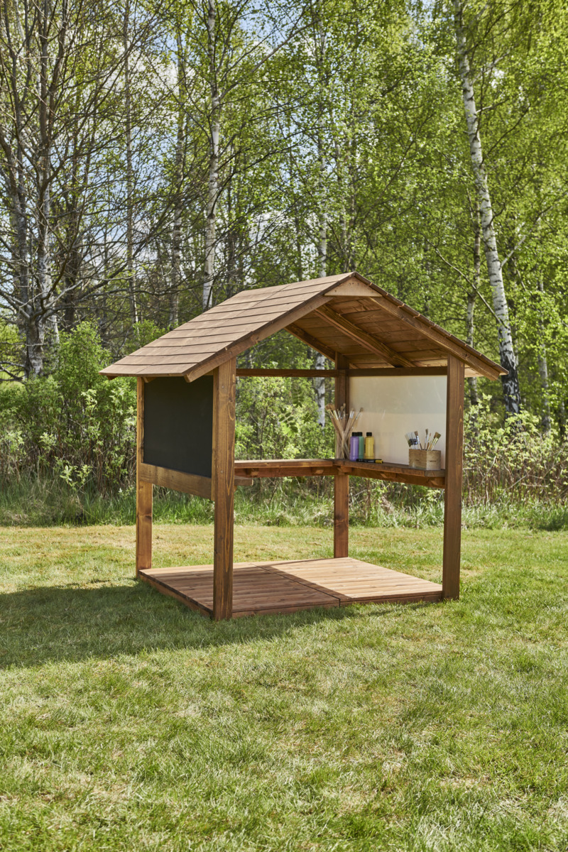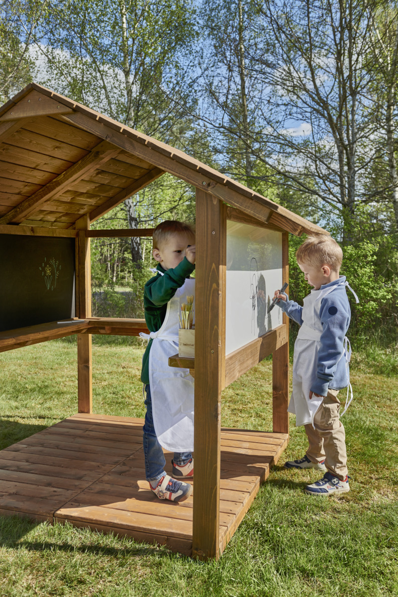 Luo pihalle luova ja innostava ympäristö yhteiseen tekemiseen. Tässä pienessä talossa on kolme erilaista kirjoitus‑ ja piirustuspintaa, joista lapset voivat valita: pleksilasi, liitutaulu ja valkotaulu. Talo on varustettu hyllyillä telineiden edessä, mikä helpottaa tarvikkeiden laskemista ja pitää työskentelyn sujuvana. Katto suojaa sekä sateelta että voimakkaalta auringolta, joten toiminta onnistuu säästä riippumatta. Pleksilasille ja valkotaululle voi piirtää suoraan pyyhittävillä tusseilla tai maaleilla, ja liitutaululle parhaiten sopivat liitukynät. Valmistettu kestävästä FSC-sertifioidusta männystä ja pintakäsitelty öljypohjaisella lakalla ulkokäyttöön. Ankkurointiratkaisu myydään erikseen: maakiinnitykseen tarvitaan 4 kpl, tuotenumero 161297, tai pintakiinnitykseen tuotenumero 151133. Toimitetaan osina. Asiakas vastaa asennuksesta. Toimitusmaksu 100 €/tilaus.