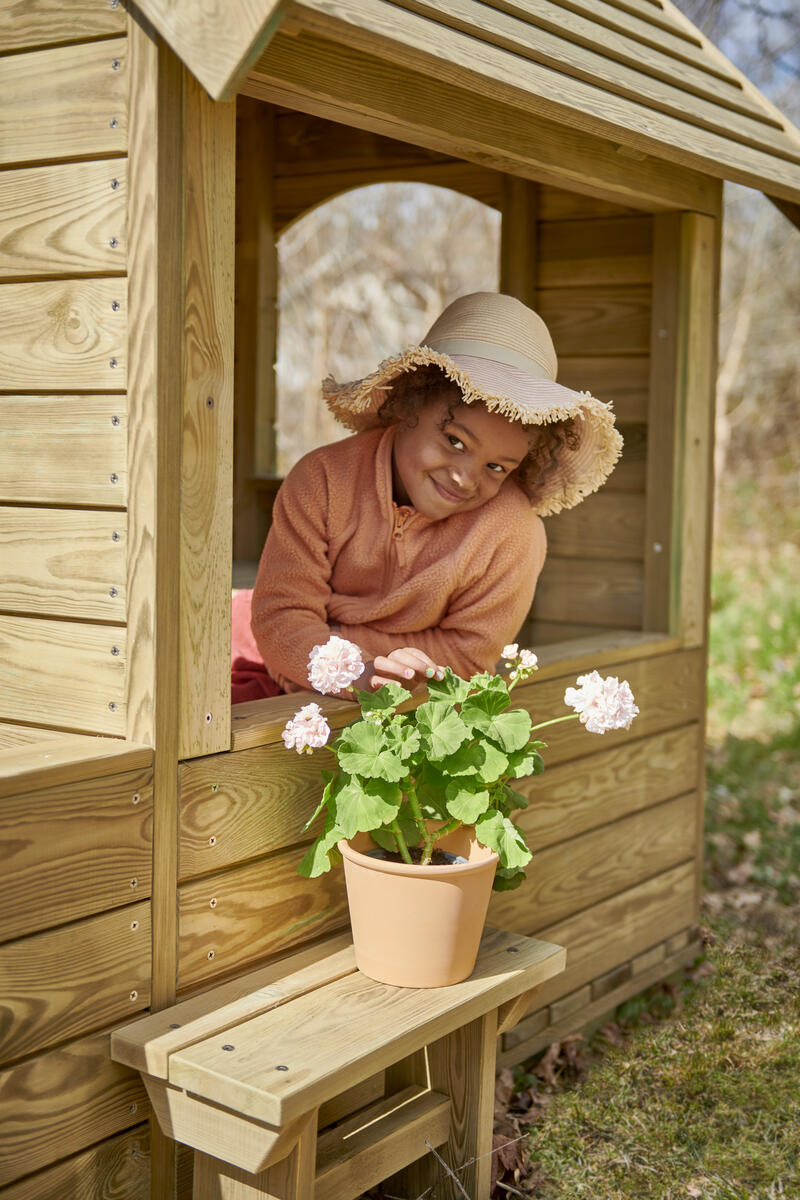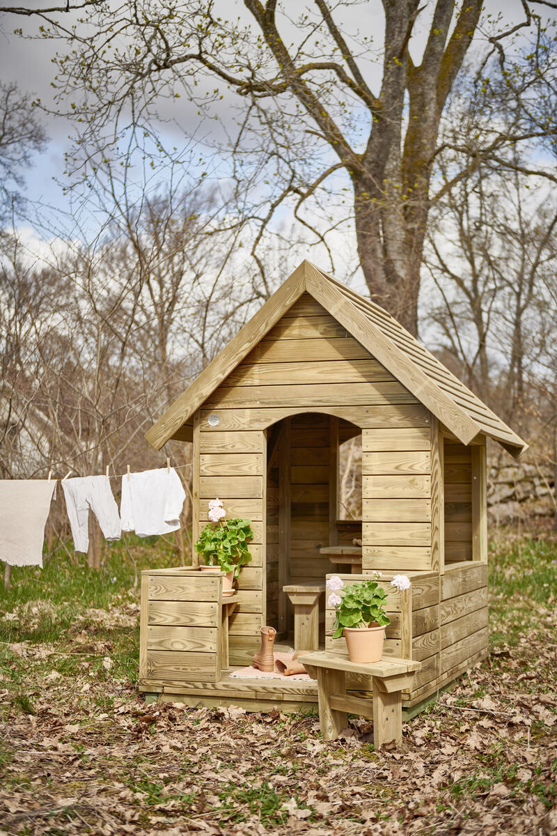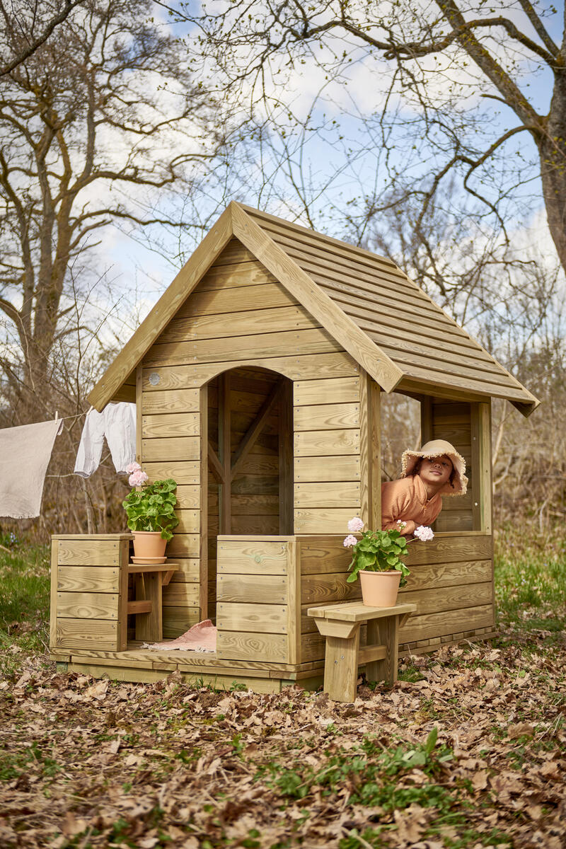 Viihtyisä ja helposti sijoitettava pieni leikkimökki, joka kutsuu mukaan leikkiin. Leikkimökissä on toisella sivulla pieni pöytä, keskellä puolikorkea väliseinä ja vastakkaisella sivulla penkki. Väliseinä mahdollistaa sen, että lapset, jotka eivät halua osallistua roolileikkiin, voivat silti olla mukana ja leikkiä rinnalla. Päädyt ovat täysin avoimet, mikä antaa aikuisille hyvän näkyvyyden, mutta tarjoaa lapsille myös sopivasti omaa rauhaa. Valmistettu kestävästä, PEFC-sertifioidusta massiivimännystä. Mitat: 128 x 145 x 171 cm. Toimitetaan osina. Maahan upotettava tai pintakiinnitettävä asennus valitaan lisävalinnoista.Asiakas vastaa asennuksesta. Toimitusmaksu 100 €/tilaus.