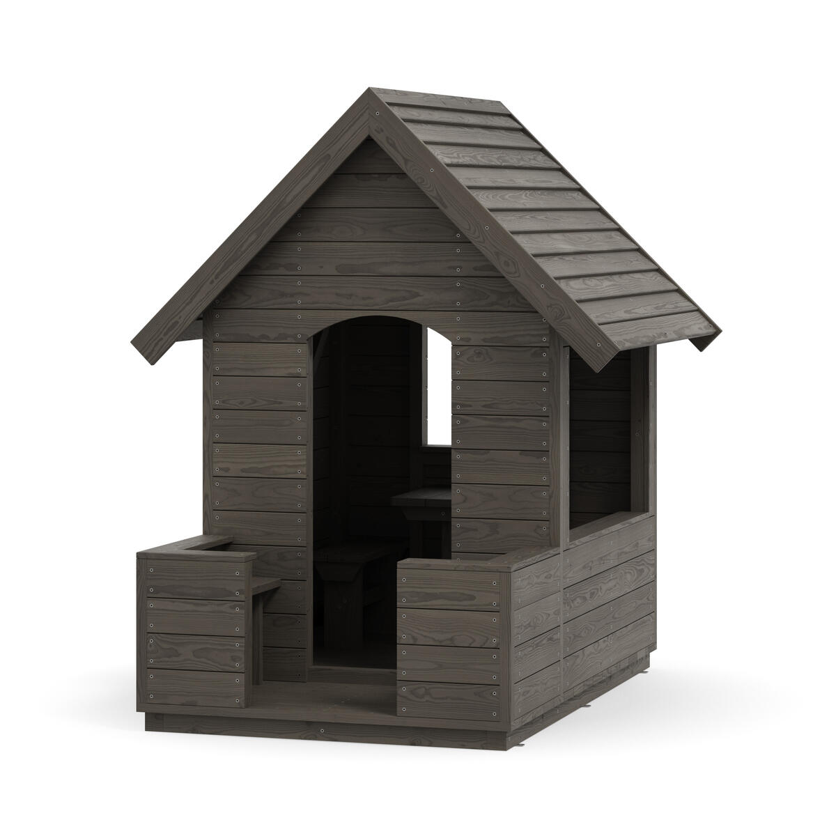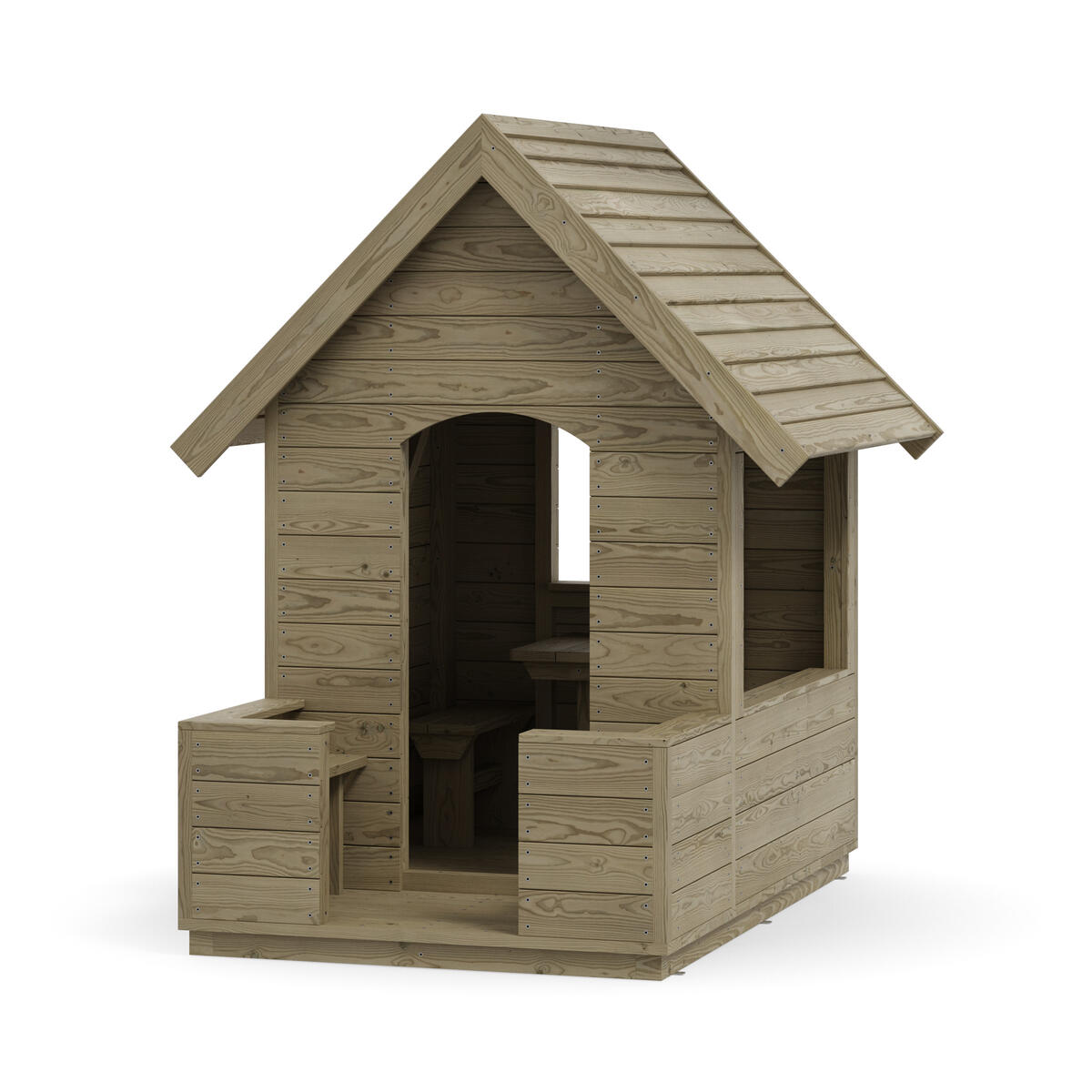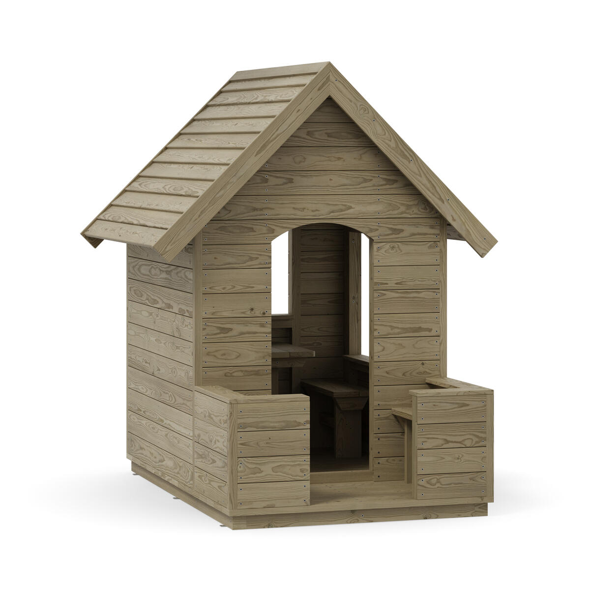 Viihtyisä ja helposti sijoitettava pieni leikkimökki, joka kutsuu mukaan leikkiin. Leikkimökissä on toisella sivulla pieni pöytä, keskellä puolikorkea väliseinä ja vastakkaisella sivulla penkki. Väliseinä mahdollistaa sen, että lapset, jotka eivät halua osallistua roolileikkiin, voivat silti olla mukana ja leikkiä rinnalla. Päädyt ovat täysin avoimet, mikä antaa aikuisille hyvän näkyvyyden, mutta tarjoaa lapsille myös sopivasti omaa rauhaa. Valmistettu kestävästä, PEFC-sertifioidusta massiivimännystä. Mitat: 128 x 145 x 171 cm. Toimitetaan osina. Maahan upotettava tai pintakiinnitettävä asennus valitaan lisävalinnoista.Asiakas vastaa asennuksesta. Toimitusmaksu 100 €/tilaus.