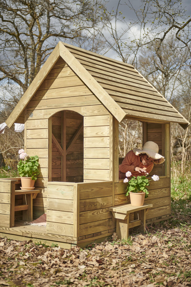 Monikäyttöinen leikkitalo, joka rikastaa pihan toimintaa ja innostaa mielikuvitukselliseen leikkiin. Pieni talo sopii yhtä hyvin kaupaksi, torikojuksi, kodiksi kuin rauhalliseksi leikkipaikaksi. Etuosassa on suuri ikkuna, joka toimii tiskinä, sekä kaksi liitutaulua leikkiin ja viestintään. Avoin ja selkeä rakenne tukee monenlaisia rooli‑ ja yhteisleikkejä. Valmistettu kestävästä FSC-sertifioidusta männystä ja pintakäsitelty vesiohenteisella lakalla ulkokäyttöön. Ankkurointiratkaisu myydään erikseen: seinäkiinnitykseen tarvitaan 2 kpl, tuotenumero 151133, tai maakiinnitykseen 4 kpl, tuotenumero 161297. Toimitetaan osina. Asiakas vastaa asennuksesta. Toimitusmaksu 100 €/tilaus.