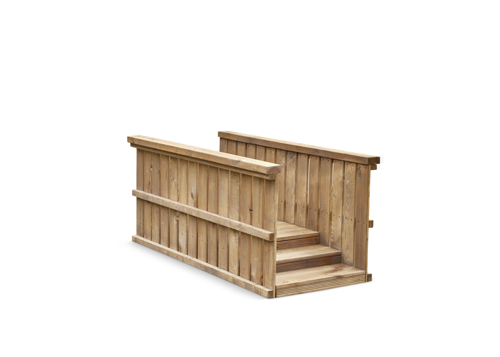 Tässä rakenteessa lapset harjoittelevat turvallisesti portaissa kulkemista ja ramppia pitkin liikkumista. Rakenne tukee tehokkaasti karkeamotoriikan, koordinaation ja tasapainon kehittymistä sekä innostaa aktiiviseen liikkeeseen. Samalla se toimii monipuolisena elementtinä mielikuvitus‑ ja roolileikeissä. Portaikko rampilla tuo vaihtelua ja toiminnallisuutta pihan leikkiympäristöön. Valmistettu kestävästä FSC-sertifioidusta männystä ja pintakäsitelty vesiohenteisella lakalla, joka sopii hyvin ulkokäyttöön. Ankkurointi myydään erikseen: maakiinnitykseen tarvitaan 4 kpl, tuotenumero 161297, tai pintakiinnitykseen tuotenumero 151133. Toimitetaan osina. Asiakas vastaa asennuksesta. Toimitusmaksu 100 €/tilaus.