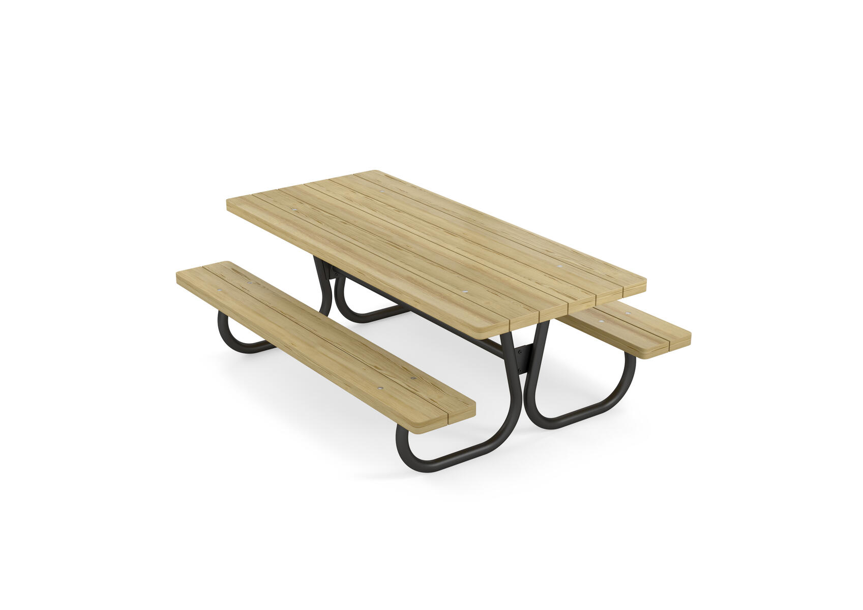 Iso ja vankkarakenteinen pöytä, jossa kiinteät penkit. Runko 42 mm putkea. Pöytälevy ja penkit öljyttyä mäntyä. Suosittelemme käsittelemään penkin vesiohenteisellä puuöljyllä ennen käyttöä ulkona käyttöiän pidentämiseksi. Penkki tulee öljytä uudelleen tarvittaessa. Pöytälevyn leveys 72 cm ja pituus 230 cm. Lämpösinkitty runko. Toimitetaan osina. Istuinkorkeus 32 cm