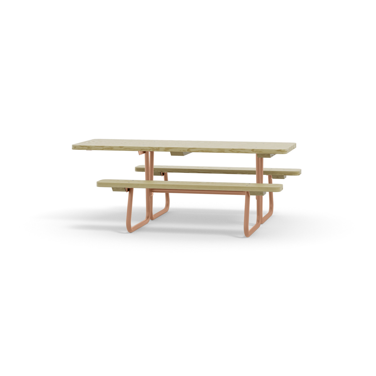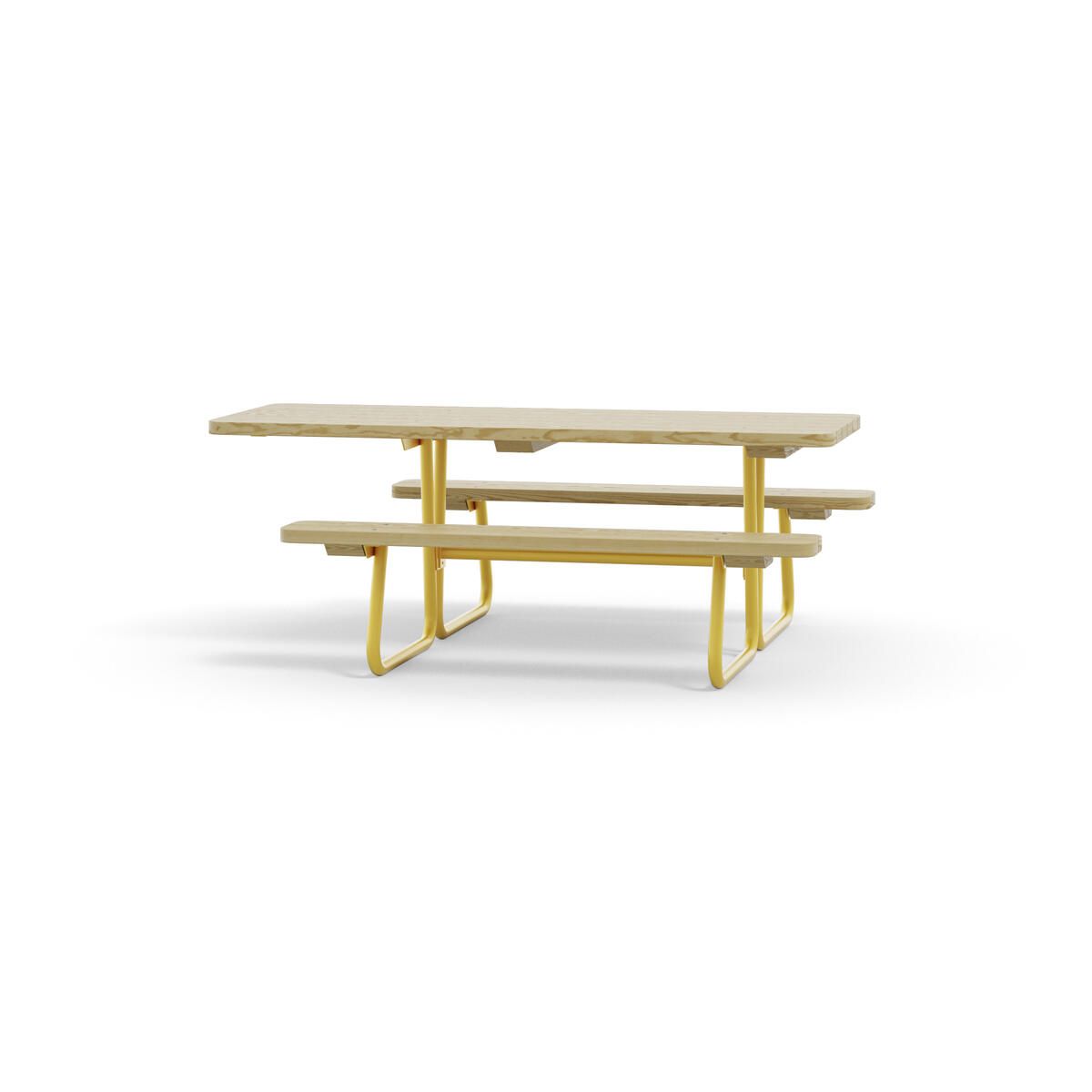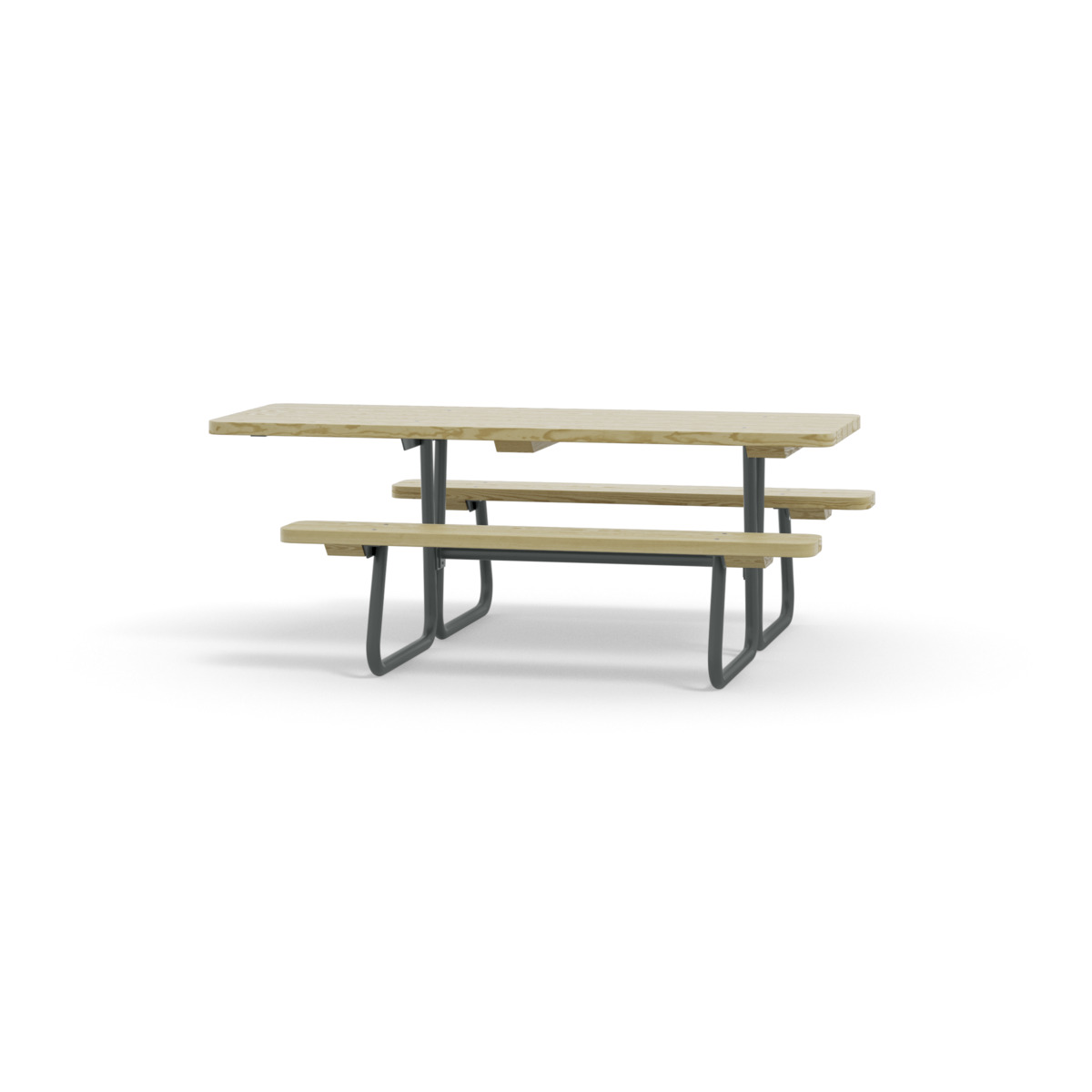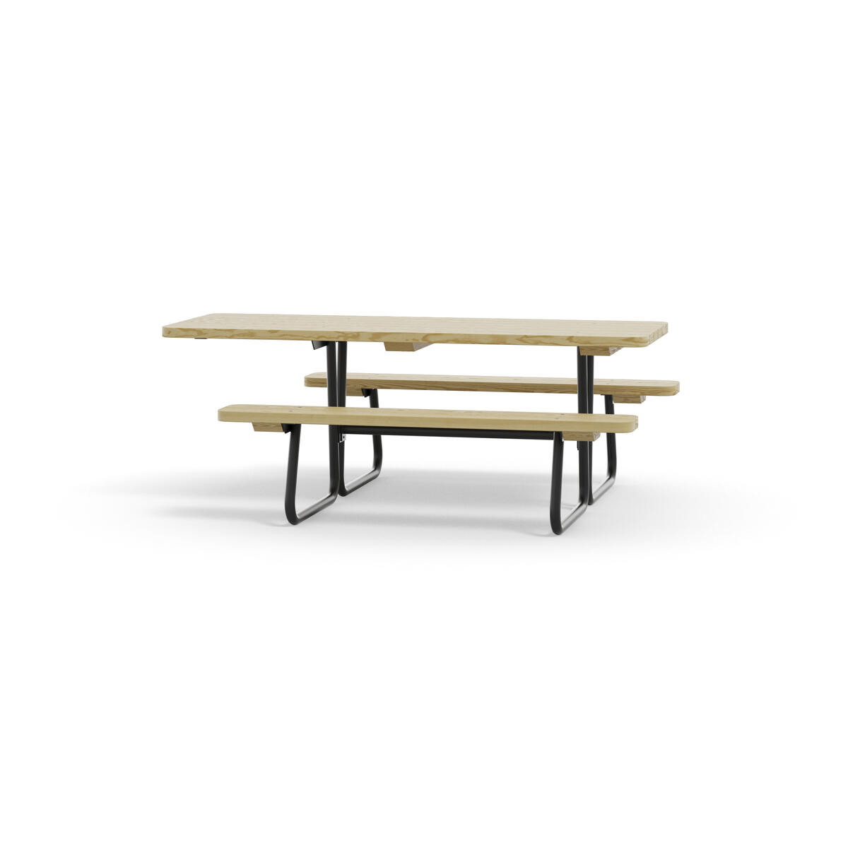 Rörvik-sarjaan kuuluva piknikpöytä, jonka toisessa päädyssä on esteetön paikka pyörätuolia käyttävälle. Pöydän runko on kuumasinkittyä terästä, kansi ja penkit öljyttyä mäntyä. Suosittelemme käsittelemään puuosia vesiliukoisella puuöljyllä ennen käyttöä ulkotiloissa. Toista käsittely tarvittaessa. Penkkien istuinkorkeus 44 cm.
